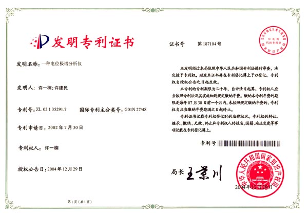 現(xiàn)在又新領(lǐng)企業(yè)另創(chuàng)新的事業(yè),公司堅持原始創(chuàng)新,不作低水平的重復(fù),擁有一批自主知識產(chǎn)權(quán),獲授權(quán)電化學(xué)分析儀器方面發(fā)明專利兩項,實用